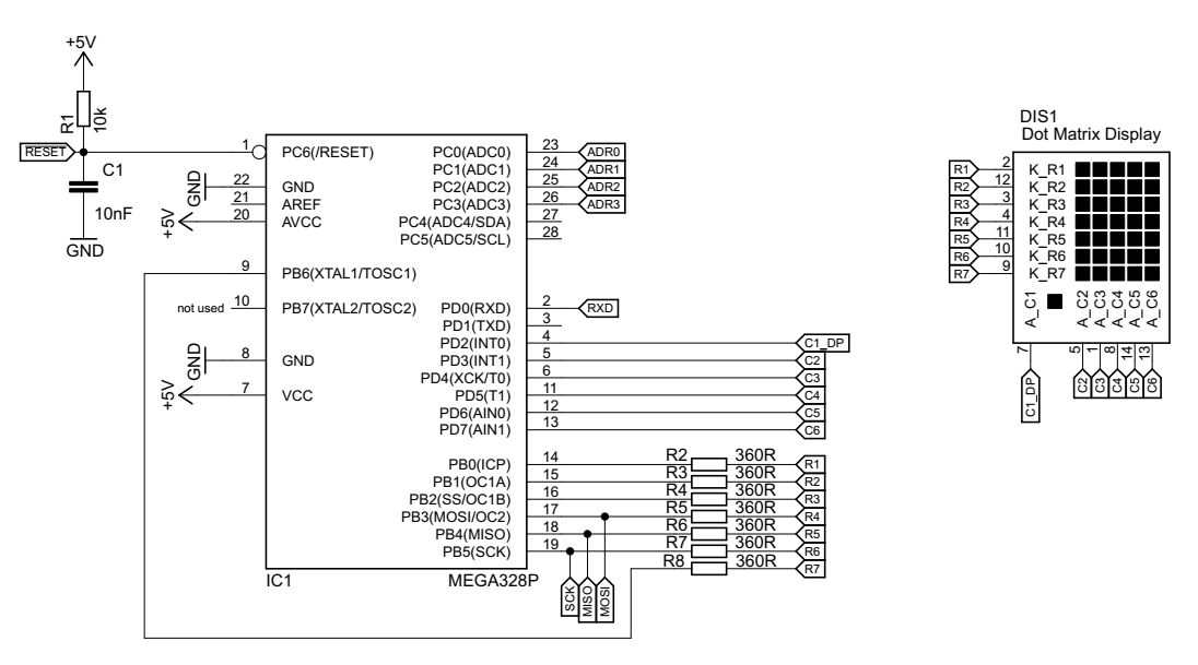 ATmega328P and a LED-Dot Matrix Display and 7 resistors 360 Ohm for R1..R7 .